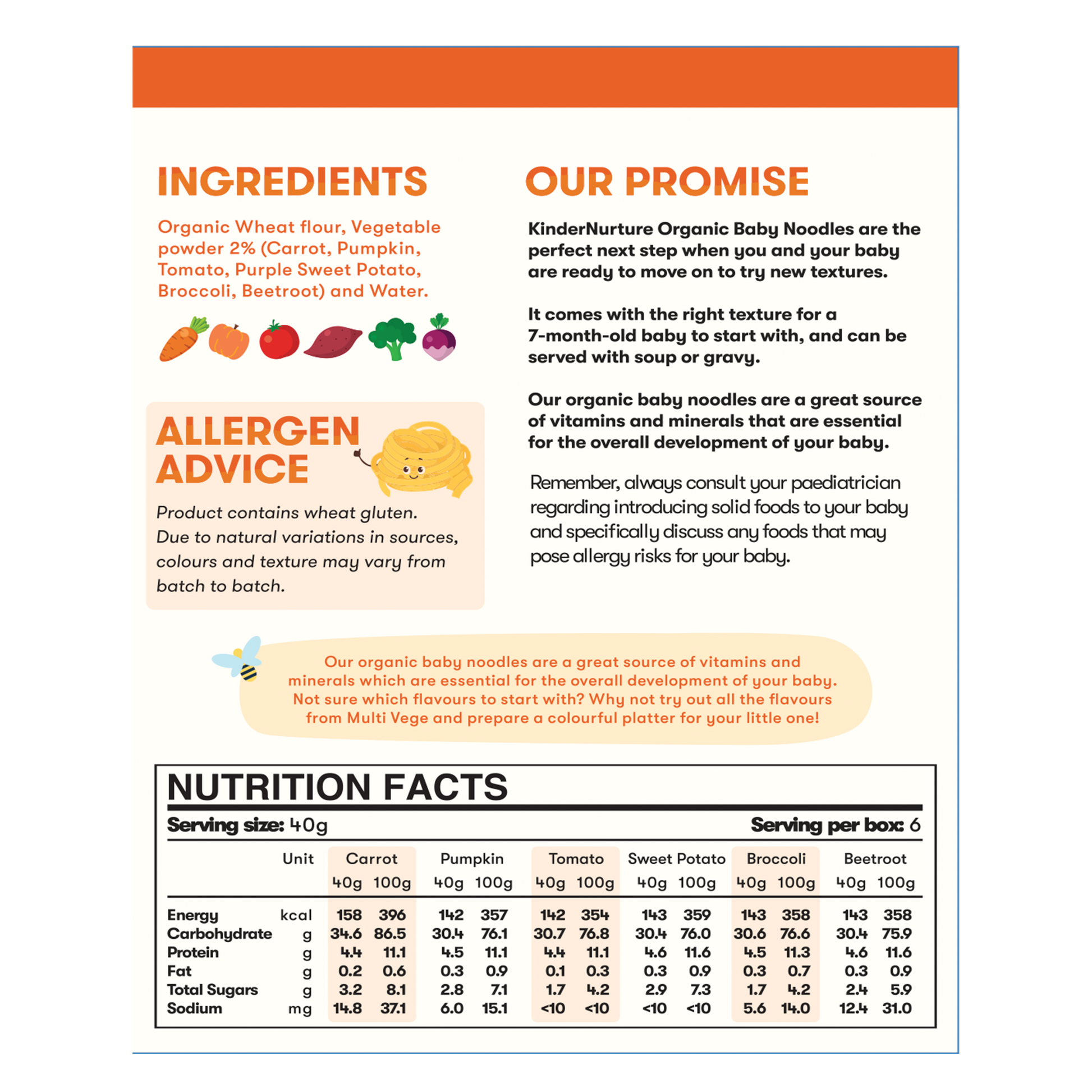 Made with love and care for your little one, KinderNurture Organic Baby Noodles are crafted from certified organic ingredients to provide wholesome nutrition with every bite. Each pack features 6 natural vegetable flavours - Carrot, Beetroot, Broccoli, Pumpkin, Sweet Potato, and Tomato - for a delicious and colourful variety that babies will enjoy!