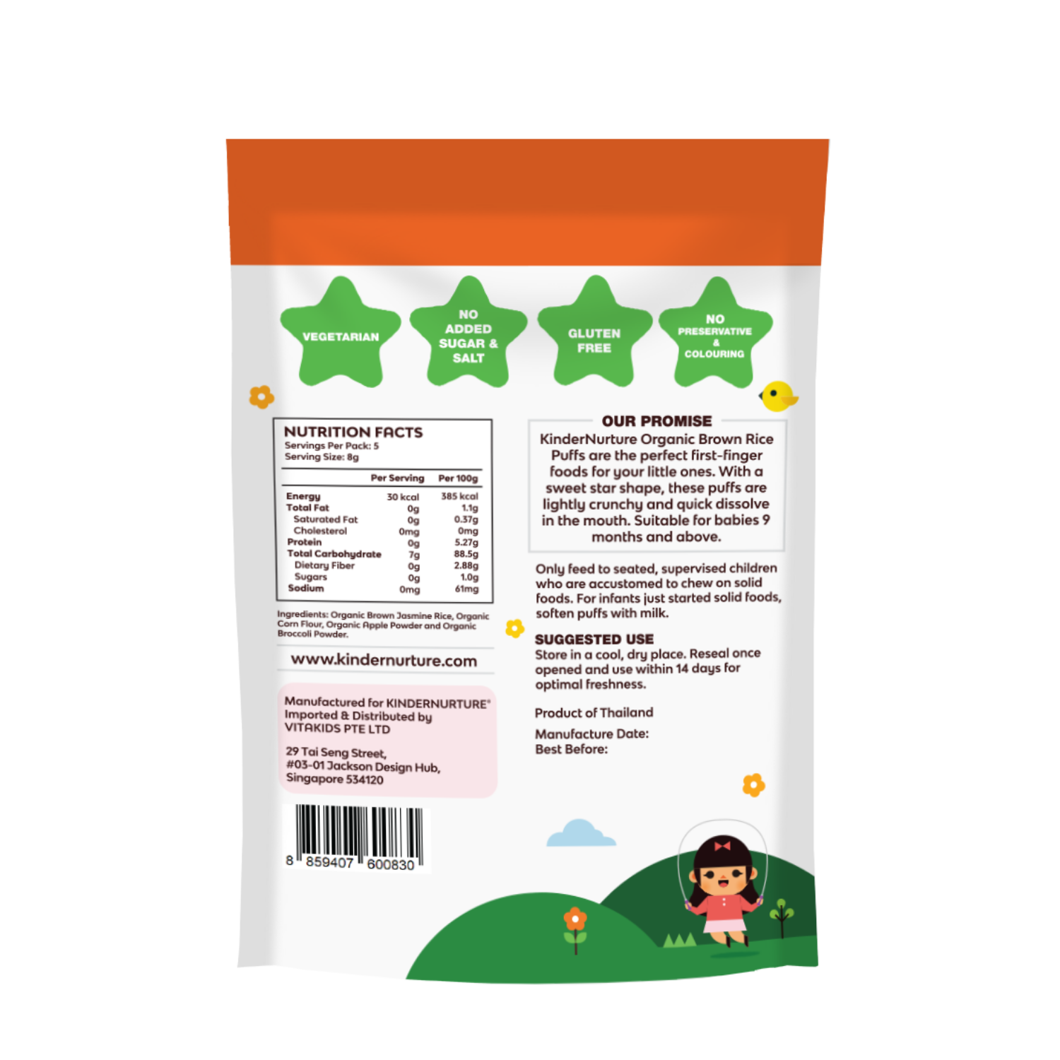 KinderNurture Organic Brown Rice Puffs are the perfect on-the-go snack for your baby! Our puffs are 100% natural, made with organic ingredients, contain no added sugar, salt, or preservatives, halal-certified and gluten-free.